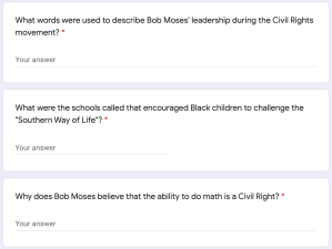 On Mondays (or Tuesdays, respectively), we celebrate black mathematicians or work on activities that highlight Black or African culture (music, art, etc), people, socioeconomic status, and more. The week before we jumped into our study of slope, our Monday feature was Bob Moses, a civil rights leader and community organizer who believed that “Math is a Civil Right”. I had students read this article by Donna Curry. posted in Change Agent, an Adult Magazine for Social Issues. Since I’m working with a younger group of students, I always ask them questions that push them to go back to the reading and find key points. Here are the questions I asked (and collected in a Google Form).