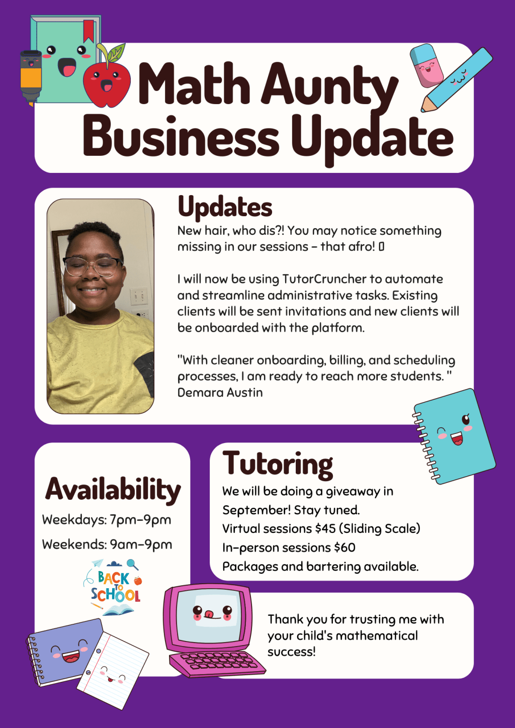Call or text 443-741-2477 or email info@mathaunty.com if you’re interested in tutoring. You may also fill out the form here: Tutoring